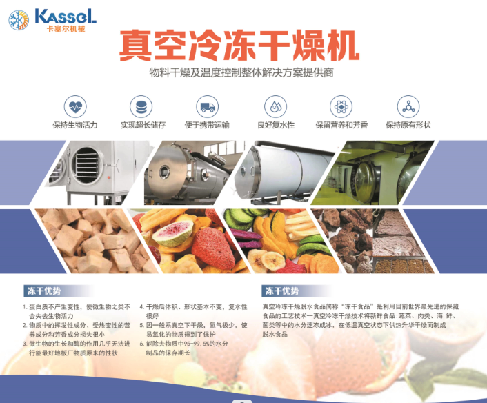 卡塞爾機械(浙江)有限公司為卡塞爾集團成員企業(yè),是一家專業(yè)提供真空冷凍干燥設備整體方案的供應商:以“凍干機”為核心產品,形成了針對果蔬、肉類(寵物食品)、速溶方便食品(凍干粉)、美容及生物制品、實驗室凍干、家用凍干及其它等七大凍干產品生產線的針對性解決方案,讓低成本、高效率、多用途的一站式凍干服務成為可能。